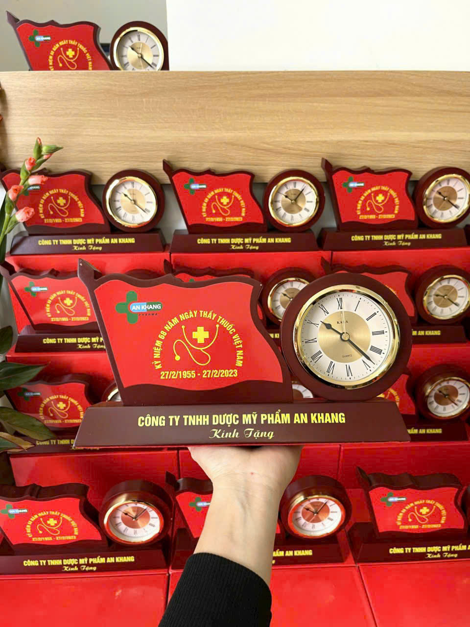 Phần chất liệu gỗ mang cảm giác ấm áp, bền bỉ; tích hợp đồng hồ để bàn giúp sản phẩm vừa có ý nghĩa lưu niệm, vừa nhắc nhớ thời gian và những dấu mốc quan trọng. Thiết kế gọn gàng, tinh tế, phù hợp đặt trên bàn làm việc, phòng họp hoặc không gian tiếp khách.