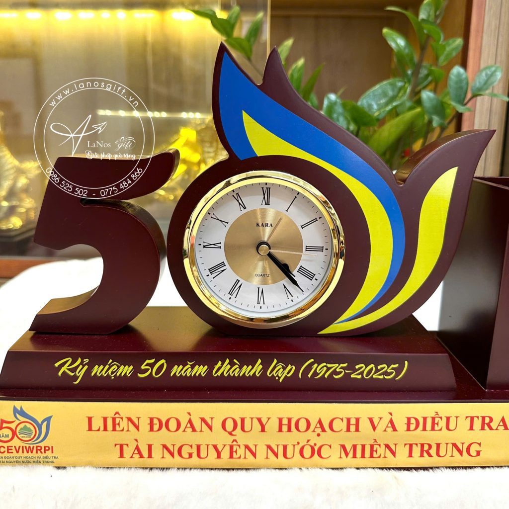 Mẫu biểu trưng gỗ có đồng hồ để bàn – LNBT 02